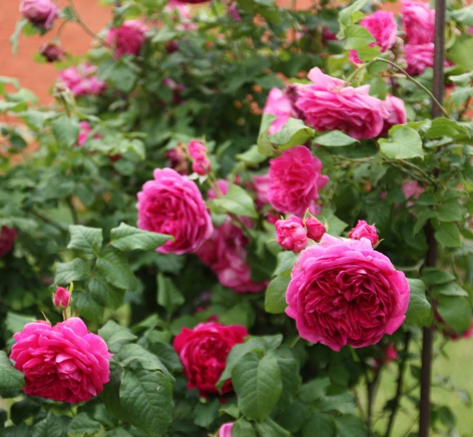 Окраска необычна для английской розы: смесь густо-мажентового, розового и красного, внешние лепестки выгорают до светло-пурпурного, и все это контрастирует с серебристой изнанкой лепестков. Цветки изящно появляются по одному в небольших кистях на мощных побегах. Куст красивый, ветвистый, около 120 см в высоту и 90 см в ширину.